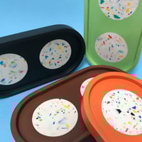 Vide-poche uni colorblock avec incrustation de ronds blancs et terrazzo multicolore.